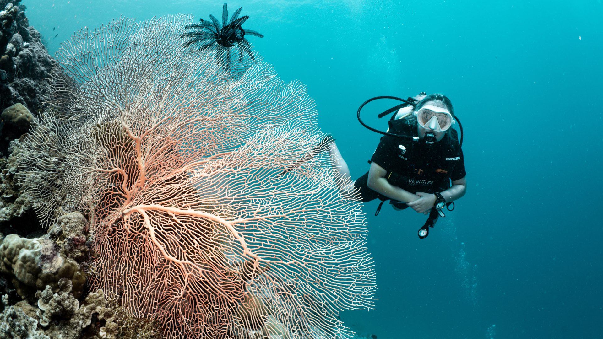 a diver on a reef in the maldives behind a large fan coral